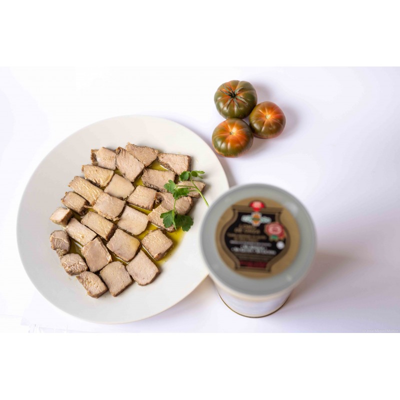 ÉLABORATION/CONSERVATION : son processus d’élaboration est entièrement artisanal. Après avoir été coupé en dés, le rôti de porc est mis à mariner puis frit dans de l’huile d’olive extra vierge. Une fois emballé, le produit est entièrement stérilisé et peut être conservé à température ambiante.