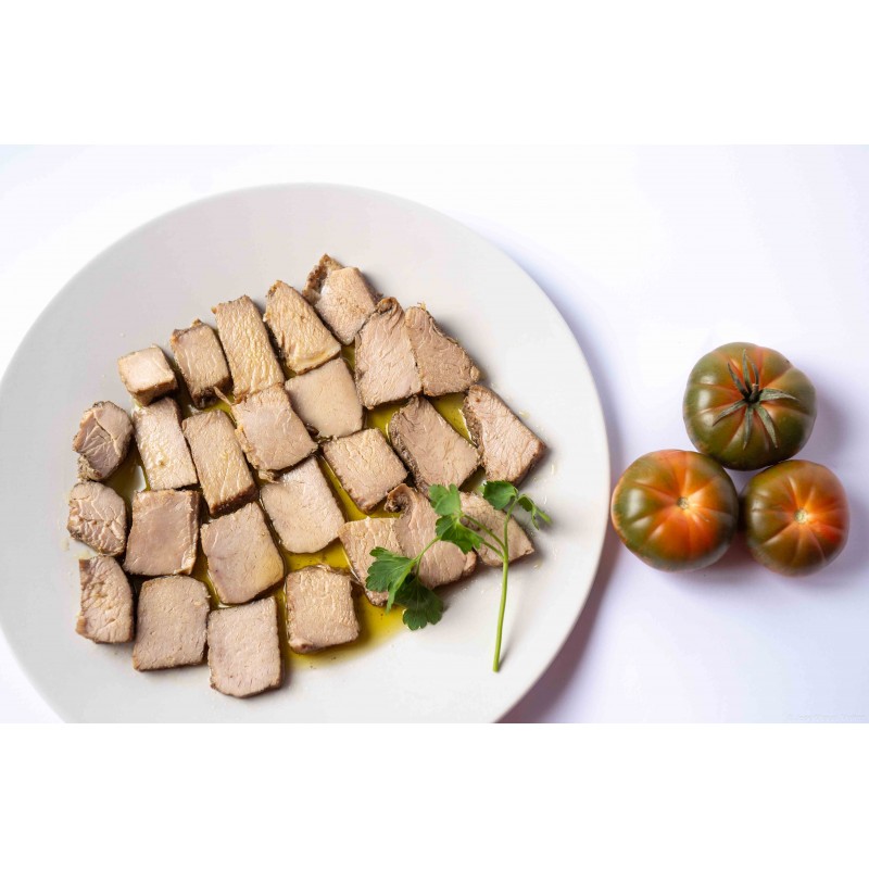 ÉLABORATION/CONSERVATION : son processus d’élaboration est entièrement artisanal. Après avoir été coupé en dés, le rôti de porc est mis à mariner puis frit dans de l’huile d’olive extra vierge. Une fois emballé, le produit est entièrement stérilisé et peut être conservé à température ambiante.