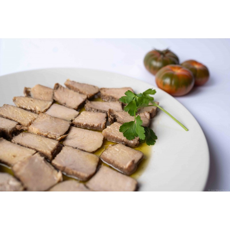 ÉLABORATION/CONSERVATION : son processus d’élaboration est entièrement artisanal. Après avoir été coupé en dés, le rôti de porc est mis à mariner puis frit dans de l’huile d’olive extra vierge. Une fois emballé, le produit est entièrement stérilisé et peut être conservé à température ambiante.